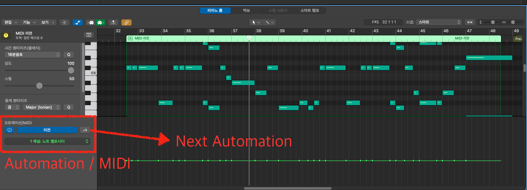 Shift + Option + 위아래 = 한 옥타브씩 이동