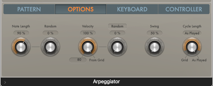 Option 창에선 Velocity, Swing 을 비롯한 다양한 옵션들을 지정할 수 있다.