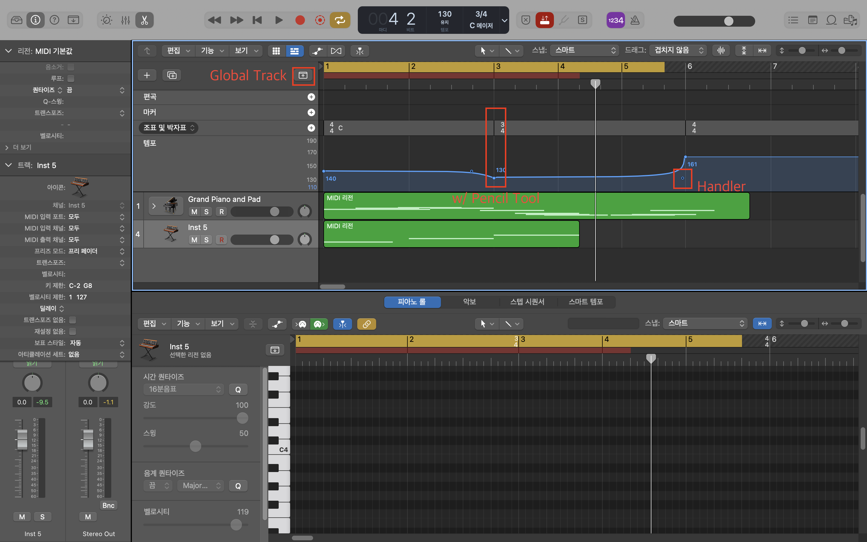 Command를 눌러 Pencil Tool로 전환: Region 작성 후 Command + 4를 눌러 Piano Roll로 진입한다.
