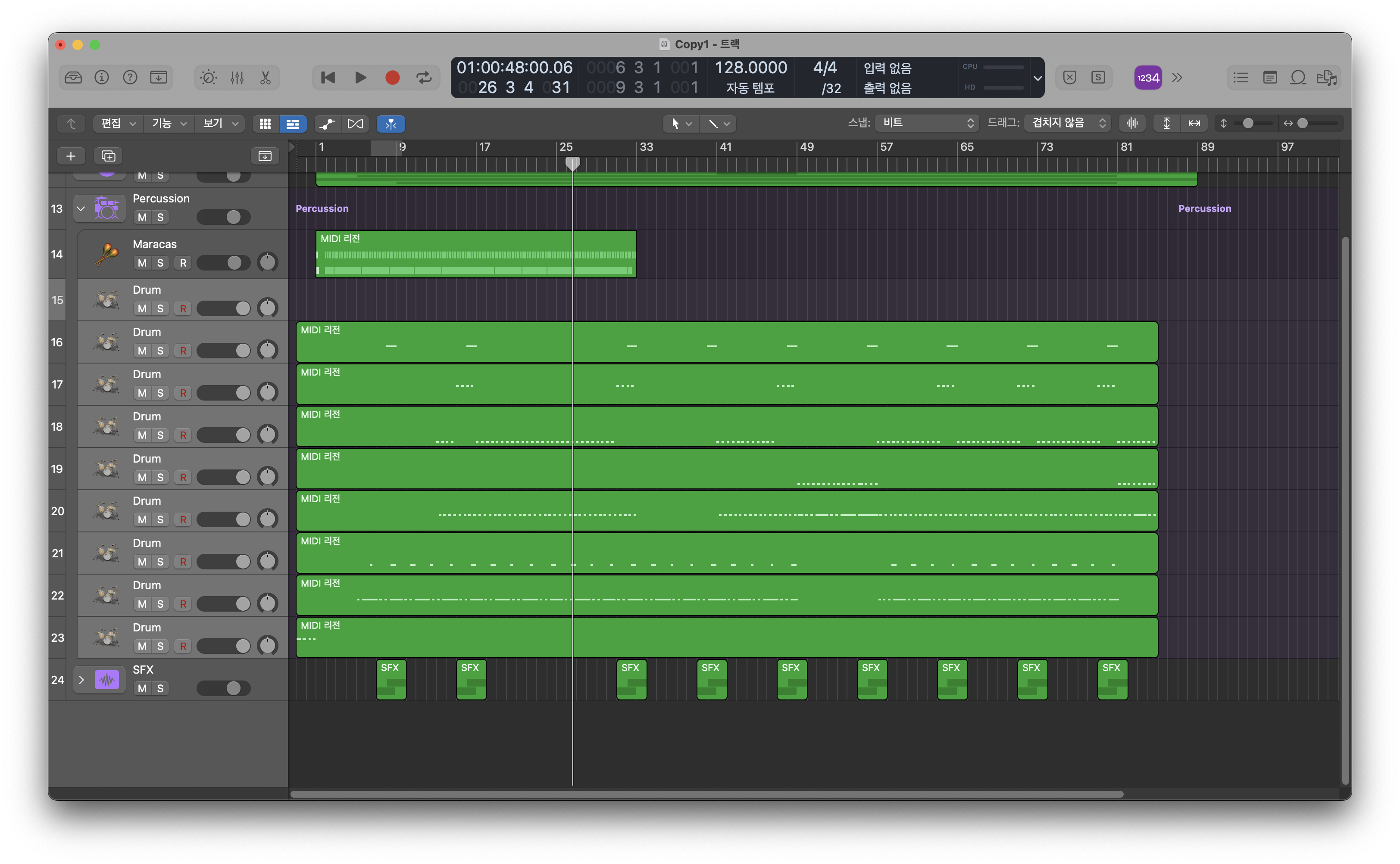 우선, 여러 개로 나누어진 한 트랙의 리전에 대해 Command + J를 눌러 리전을 하나로 결합한다.